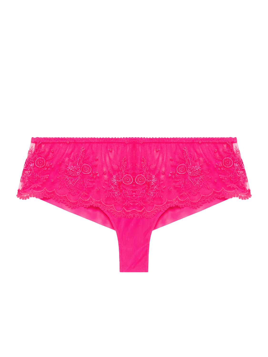 The Intrigue Boyshort showcases romantic floral embroidery on sheer tulle in the front and double-lined semi-sheer mesh in the back. Sits low on the hips with a sexy, cheeky cut that makes for a show-stopping set.