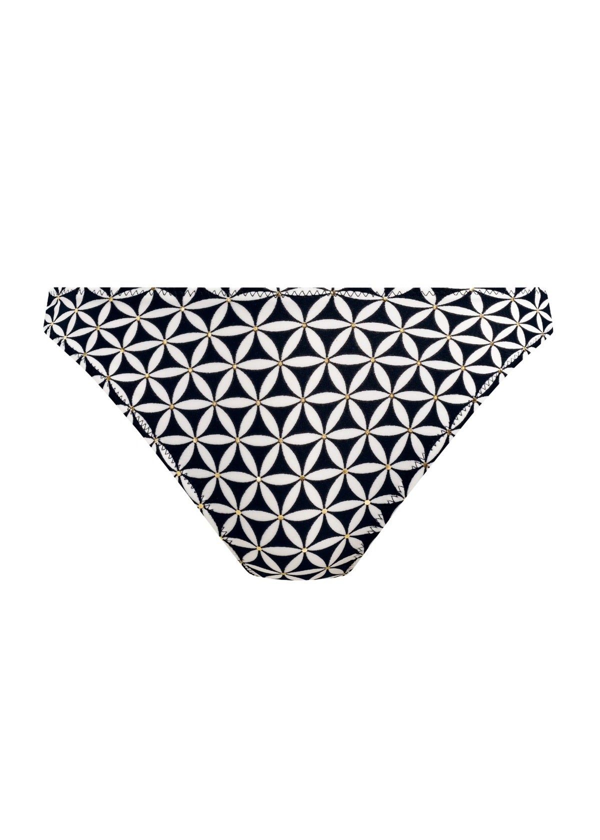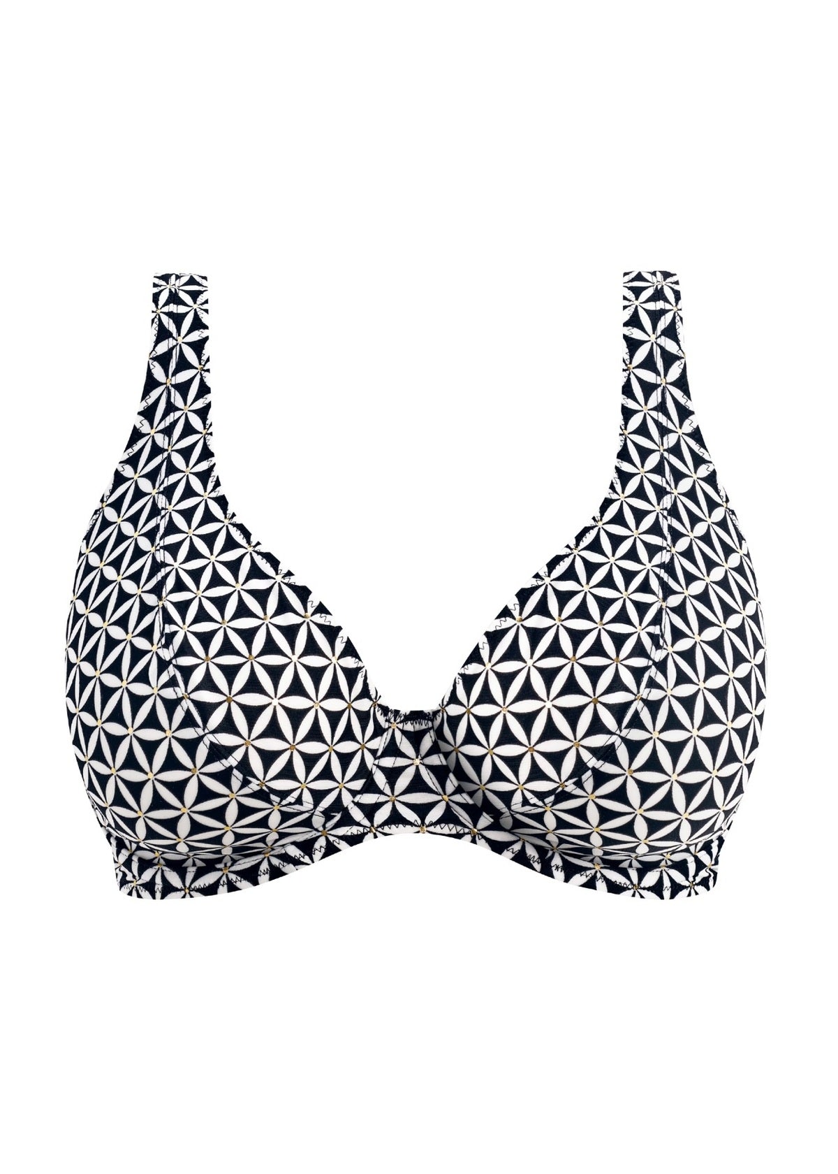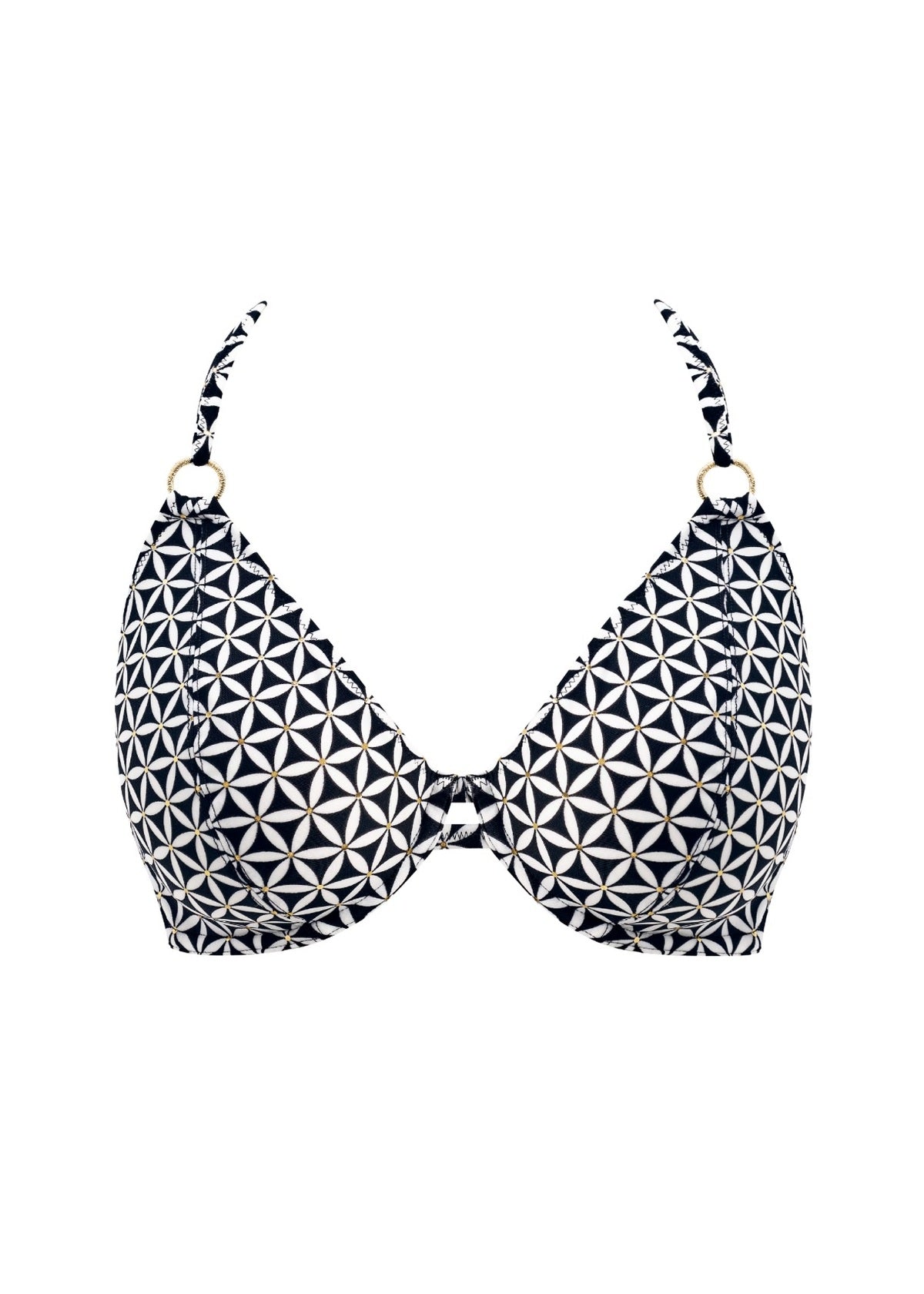 Regular price $66.00The Freya Koh Tao Underwire Halter Bikini Top taps into the charm of vintage vacations but with a modern twist. This retro-inspired monochromatic print features a tessellated geometric pattern, reminiscent of exotic tiles. Rich gold accents provide a touch of luxury to this beautiful range from Freya. This bikini top offers a flattering plunge neckline and underwire cups with no cradle. The cups are lined in power-net for added shaping and support. The halter straps tie securely behind the neck.